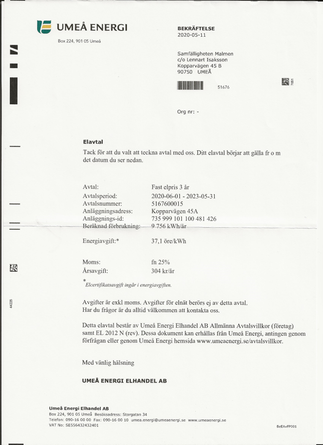 Elavtal gällande från 1 juni 2020 till 31 maj 2023